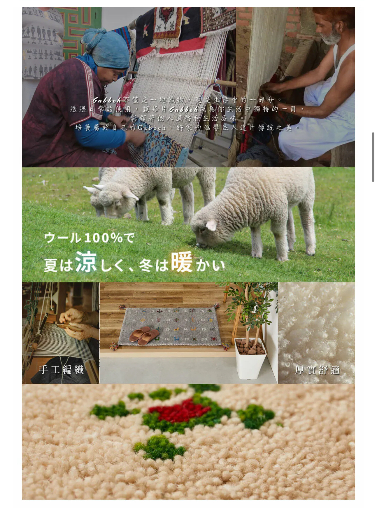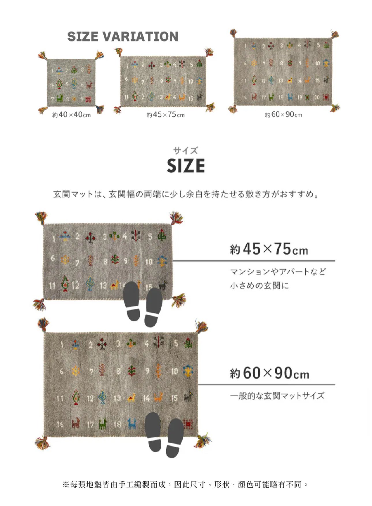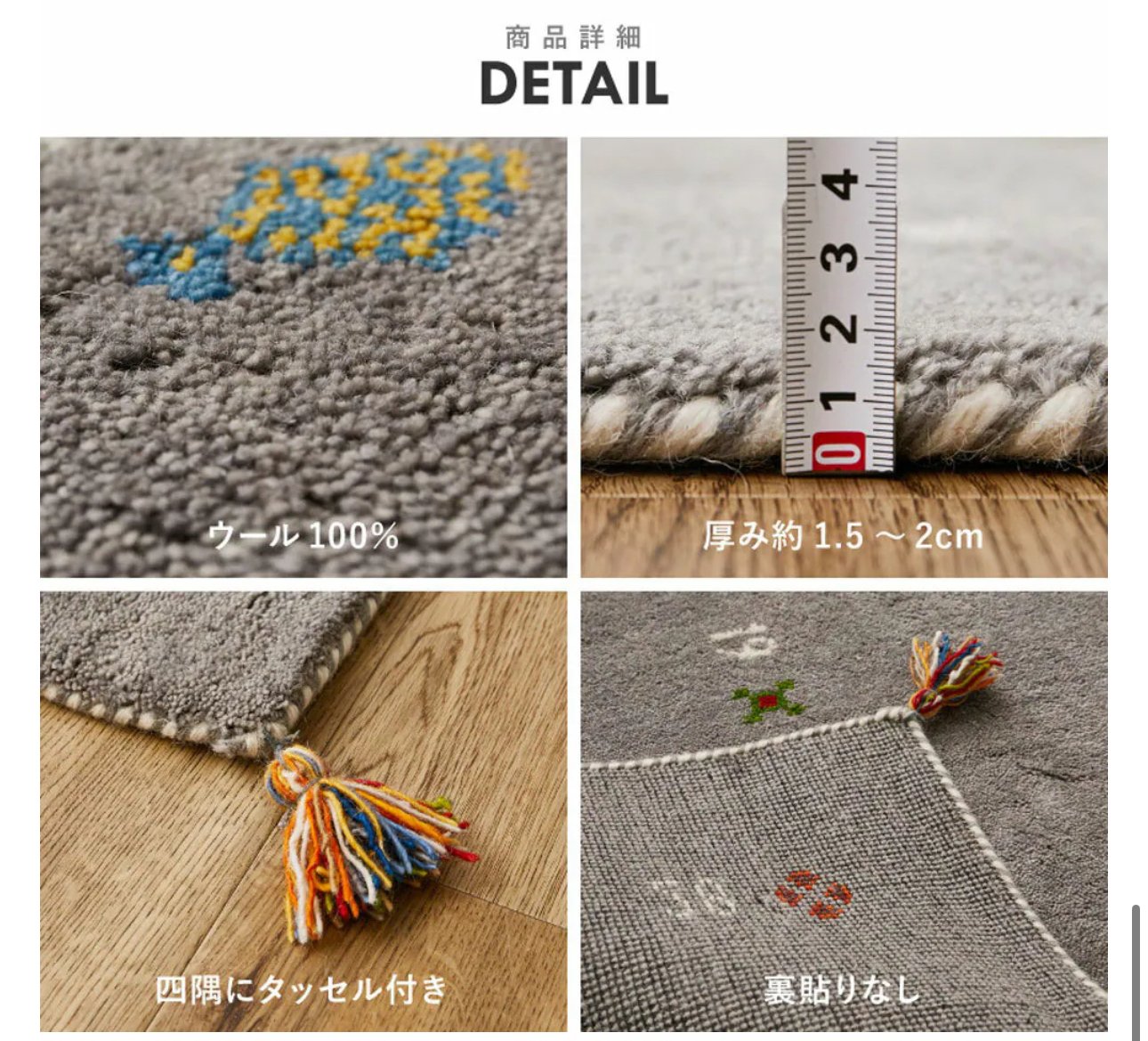 【HAGiHARA】Gabbeh印度手工編製羊毛地墊 魯菲系列 素朴日常 遊牧民族風格手織Gabbeh傳統設計, 100%高品質羊毛手工編織製作,有絕佳的隔熱性、調溼性、防污性,讓您感受到每一寸天然材質 Gabbeh的魅力。 羊毛地墊富有彈性、可以抗靜電、材質柔軟、觸感極佳,常用來裝飾住宅客廳、臥室等。 它還具有天然的抗污性和阻燃性,因此可以鋪設在任何地方,例如客廳或餐廳。 遊牧民族風格手織Gabbeh傳統設計, 100%高品質羊毛手工編織製作 有絕佳的隔熱性、調溼性、防污性,讓您感受到每一寸天然材質 Gabbeh的魅力。 羊毛地墊富有彈性、可以抗靜電、材質柔軟、觸感極佳,常用來裝飾住宅客廳、臥室等。 它還具有天然的抗污性和阻燃性,因此可以鋪設在任何地方,例如客廳或餐廳。 ■Gabbeh地墊是以來自遊牧民族日常生活的樸素美麗的傳統花紋與圖案為設計,每款皆由手工編織製成,獨一無二。 ■材質以100%高品質羊毛材質,厚實絨毛觸感,柔軟舒適,隔熱性、調溼性、防污性佳,十分耐用且吸音,適合放置於玄關、客廳或臥室等。 ■除了傳統純樸花紋,Gabbeh地墊也有充滿俏皮感的設計,可選擇最適合自己的款式。 ■每張地墊皆由手工編製而成,因此尺寸、形狀、顏色可能略有不同。 ■尺寸: 見附圖 ■材質: 100%羊毛 ■絨毛長約0.5cm、總厚度約1.5cm ■全手工編織,尺寸略有些微誤差。 ■使用全羊毛製作,少量絨毛附著。 ■日本企劃 印度製 * 由於本產品為手工製作,可能與顯示的尺寸略有不同。 * 為防止發霉,請偶爾在通風良好的陰涼處晾乾。 * 勿長時間暴露在陽光直射或光線下。 推薦用於玄關。五顏六色的瓷磚圖案照亮了入口。 100%羊毛,冬暖夏涼 羊毛有一層含有大量空氣的層。導熱率極低。 所以到了夏天可以阻擋酷熱。 冬天可以阻擋冷空氣 讓你一年四季都可以舒適地度過。 如果放在床邊下,冬天會阻隔地板的冰涼,夏天會減少赤腳出汗的粘膩感 讓你舒舒服服地開始新的一天。 推薦用於餐廳,因為它很難弄髒 一般會認為在廚房使用容易弄髒 但由於羊毛含有大量脂肪 纖維被塞得很緊,污垢不容易進入,因此通常可以使用吸塵器就能清除表面的灰塵和污垢。 天然材料和手工編織獨有的溫暖質感。從染色到編織,印度工匠精心完成。 編織是通過一種稱為手工打結的方法完成的在這種方法中,緯紗被手工一根一根地繫在經線上。 因為每一件都是手工編織的,每一張都不一樣。 即使是同樣的圖案或花紋,表情也略有不同,這也是其特色之一。