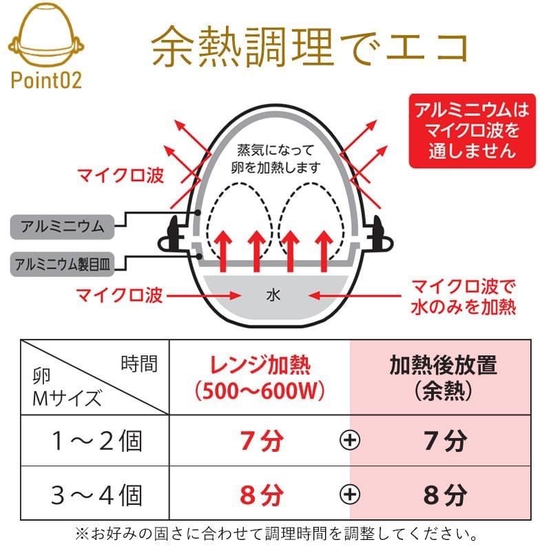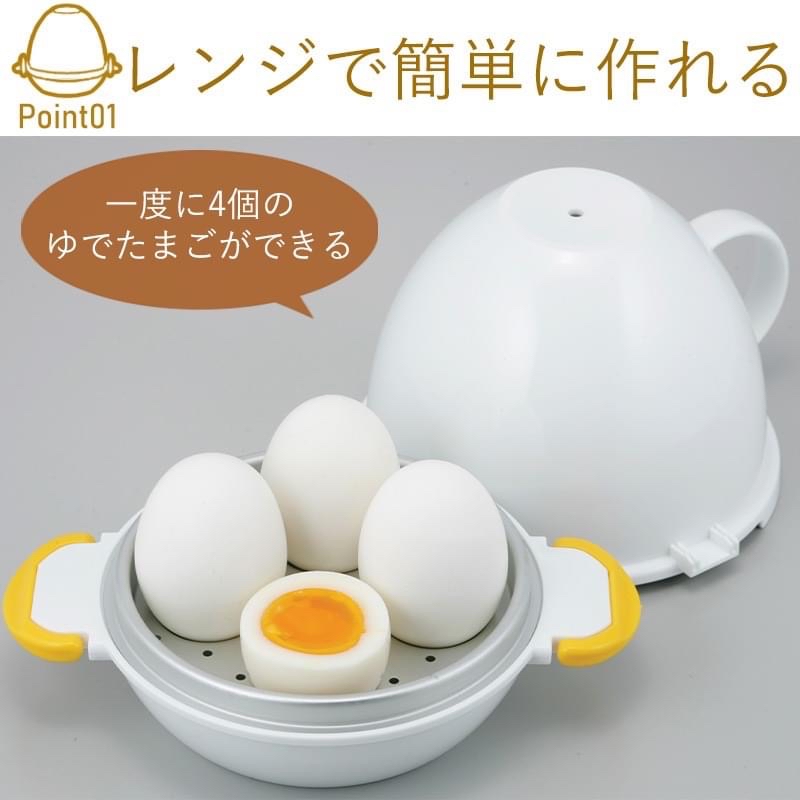 日本製微波爐煮蛋器 🇯🇵日本製 🌿一次可煮4個雞蛋,僅使用微波爐加熱水,並利用蒸汽加熱雞蛋安全鎖型,帶有即使加熱後也不會變熱的手柄 產地:日本 材質:主體/蓋/旋鈕:聚丙烯(耐熱溫度 120°C/耐冷溫度 -20°C) 尺寸:W16 x D18.5 x H13.5cm *請勿使產品受到跌落等強烈衝擊。請勿靠近火源。 *如果變形或損壞,請勿使用。如果使用金屬轉盤,請使用普通陶瓷盤。 *烹調後,容器和金屬零件會很熱。移除時請小心。不能在洗碗機中使用 *手柄周圍的線條圖案是模具匹配線。不是裂紋,所以不存在品質問題。