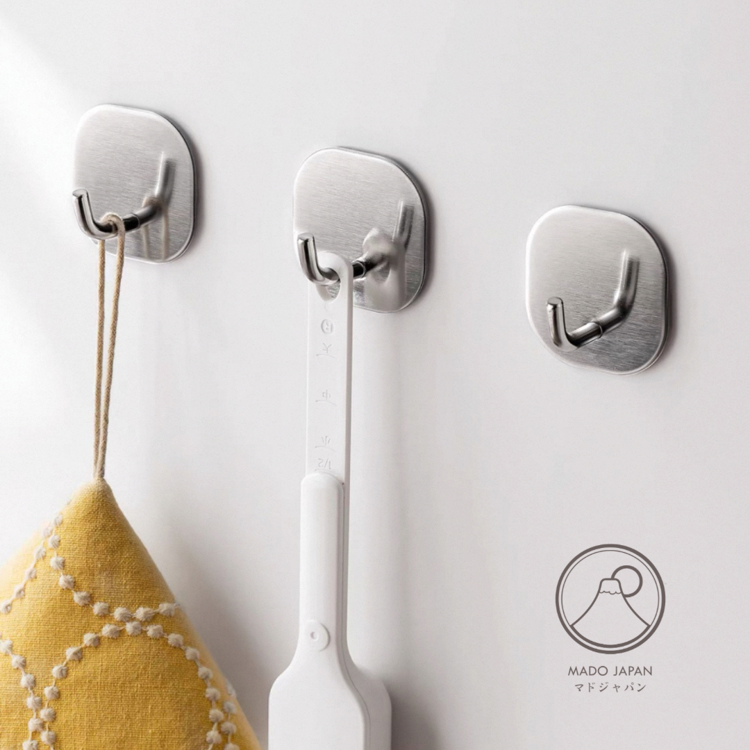 Mado JP 不鏽鋼免打孔掛勾 🌿質感美觀,用途廣泛 🌷免打孔設計,免釘牆面 🌻304不鏽鋼,拉絲工藝 🪴承重約15kg,防潮耐熱 尺寸:見附圖,每包3個 產地:中國(Mado JP連携商品) 材質:304不鏽鋼,免釘膠 透過Mado JP連携,把日系生活風格帶回家 🥰