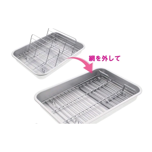 日本谷口金屬鋁製食物料理盤 🇯🇵日本製 🌿可以把油炸食物豎起來,油可快速地脫落,食物變得酥脆 🌷去除多餘的油脂已獲得健康的效果 🌻站立網可以調整位置或拆卸,變作食物盤,用途廣泛 🌸鋁製材質,可以用作解凍盤 👍容易清洗,使用方便 尺寸:約29x21x3.8cm 產地:日本 材質:鋁鐵