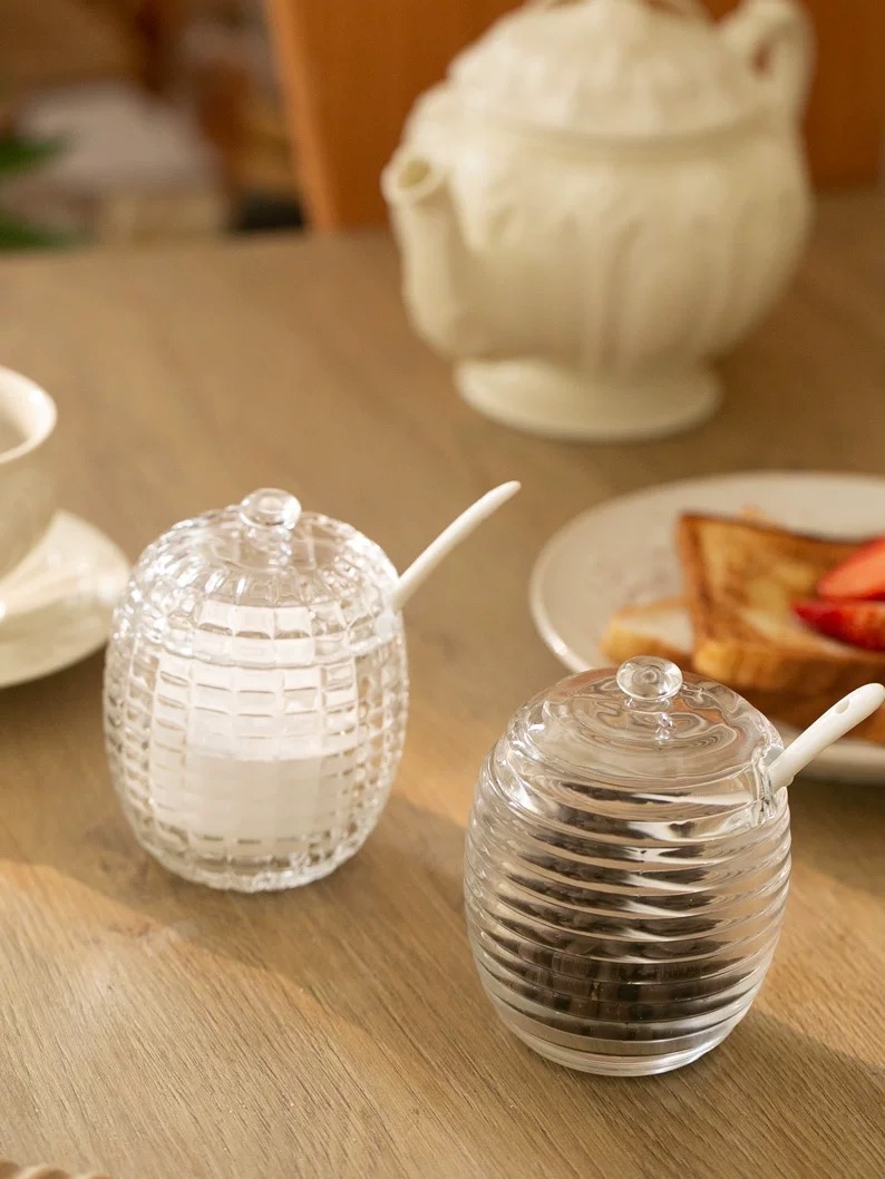 法式玻璃浮雕蜂蜜調味罐 🌱優雅復古風格 🌸透明玻璃材質,浮雕造型 🌿可收納蜜糖、調味料等 材質:玻璃 產地:中國 尺寸:高約11.5cm ***此產品匠人人手製作,如果逆光觀看會有機會出現輕微水紋或水泡,非品質問題