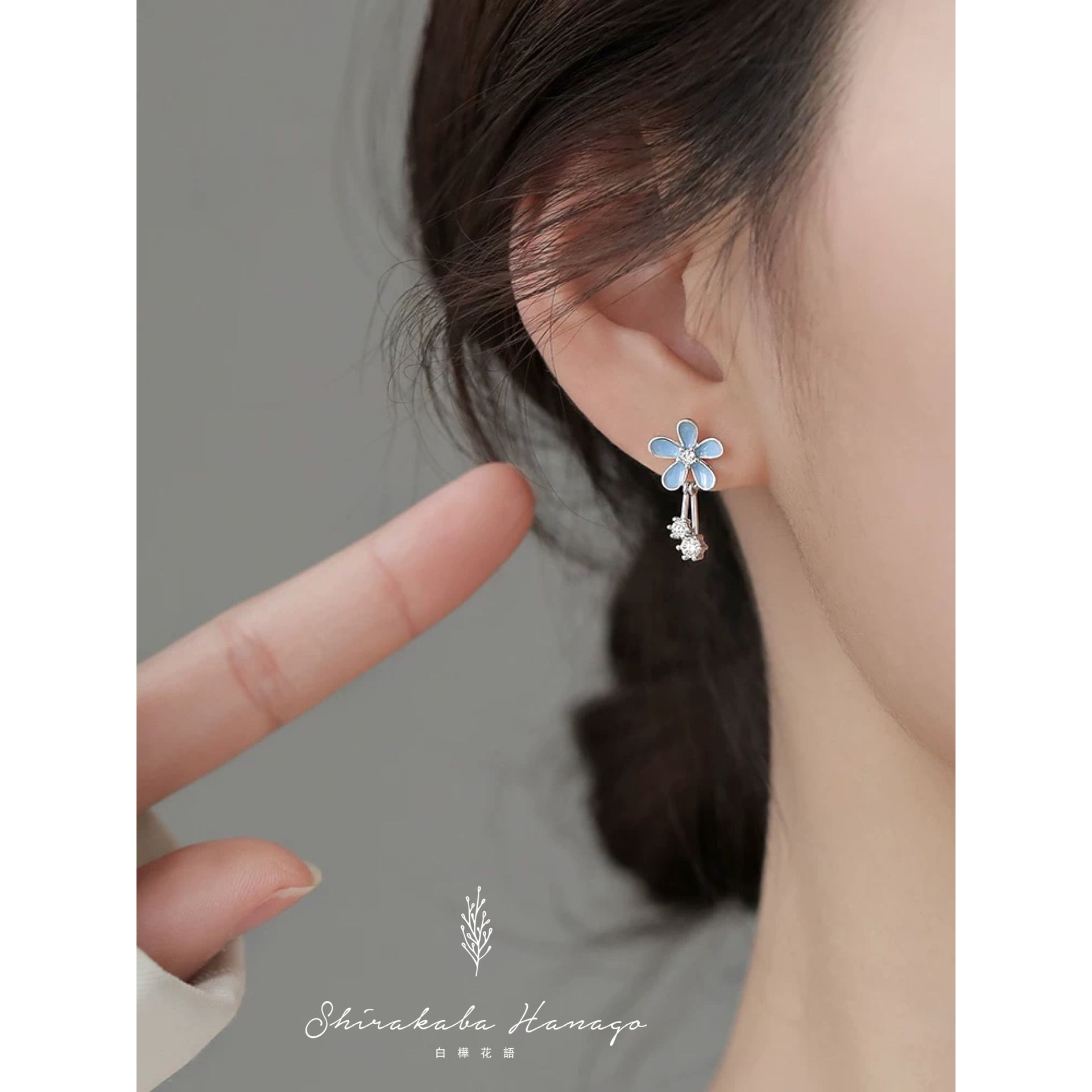 白樺花語 S925純銀藍花鋯石耳釘 🌿 The story is beautiful because of a flower that cannot be seen 🌿 🌿S925純銀針 🌸莫廸蘭色系花朵,清新文藝氣息 尺寸:長約21mm,寛約11mm 材質:純銀針,鋯石 款式:耳釘款