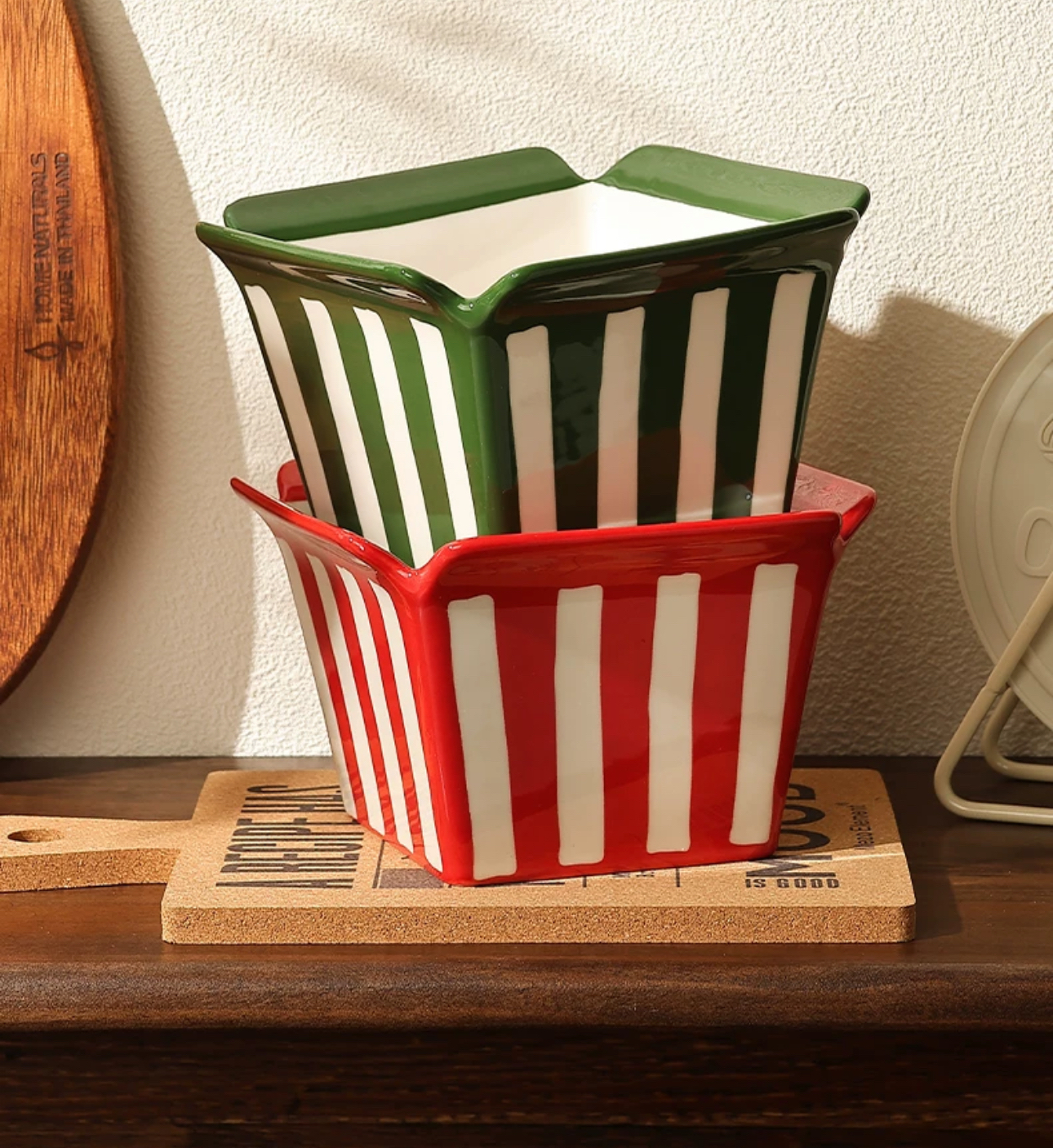 紙盒造型陶瓷零食碗 🌿條紋紙盒造型設計,增添餐桌趣味 🌷光亮釉面,手感細膩 🌻400ml大容量,陶瓷厚實易端拿 🪴可入微波爐、洗碗機、消毒櫃 尺寸:見附圖 產地:中國 材質:陶瓷