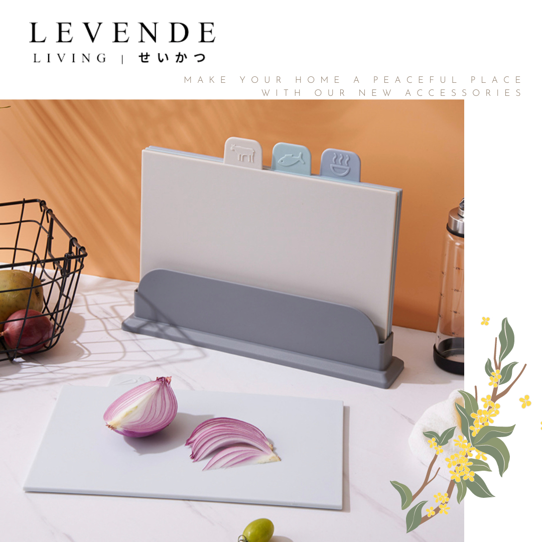 Levende 多功能分類四色切菜板套裝 🌿食品級PP環保材質 🌷磨砂質感,不易打滑 🌱高密度,不易滋生細菌,易於清洗 尺寸:見附圖,1套4件連底座 產地:中國(Levende連携商品) 材質:P P Living | LEVENDE | せいかつ ~Lighten your simple happiness with LEVENDE life~